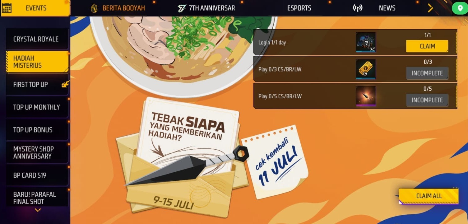 Sambil menunggu pengumuman kolaborasi tersebut, Free Fire menghadirkan event “Hadiah Misterius” yang menawarkan hadiah menarik berupa item Kunai. Untuk mendapatkan Kunai ini, pemain hanya perlu bermain 5 kali dalam mode Clash Squad (CS), Battle Royale (BR), atau Lone Wolf (LW).