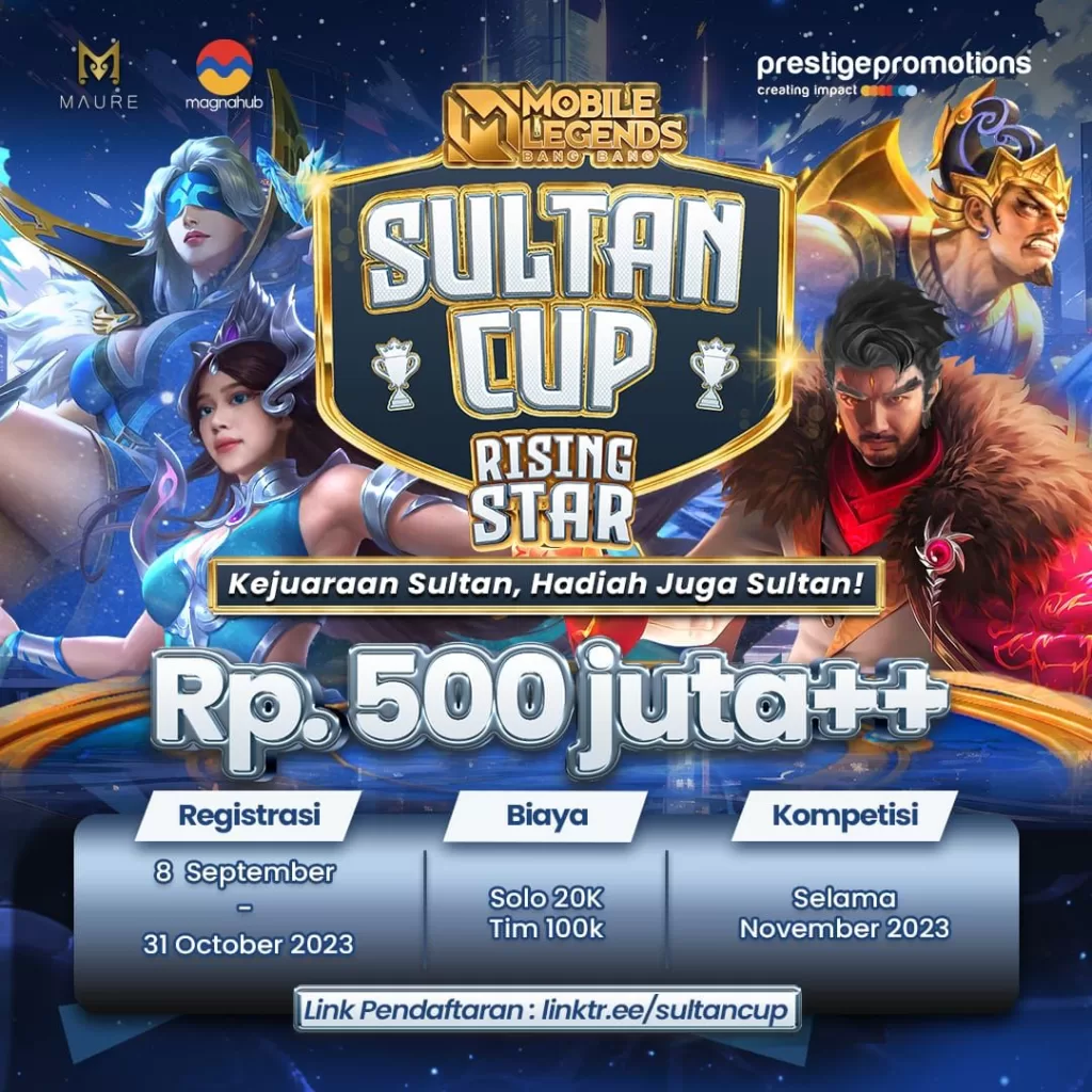 Kualifikasi MLBB Sultan Cup Rising Star diadakan secara ONLINE, untuk mencari 4 terbaik yang akan dipertemukan secara OFFLINE di Jakarta (Final & Grand Final). Daftarkan dirimu sekarang & menangkan PIALA SULTAN dan Hadiah Total 500 Juta++ !
