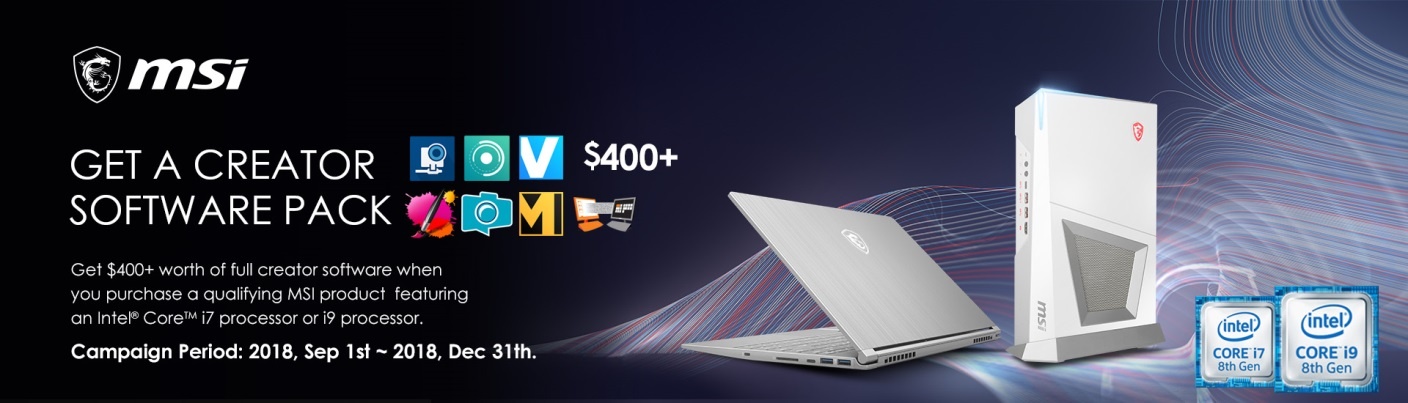 Dapatkan Creator Software Pack dengan Membeli Laptop MSI Intel® Core™ i7 atau i9 Generasi ke-8