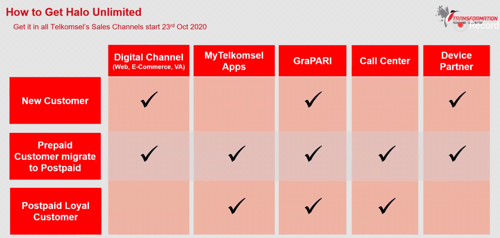 Paket Halo Unlimited tersedia secara luas bagi pelanggan pascabayar, pelanggan prabayar yang ingin melakukan migrasi, serta pelanggan baru dengan mengakses telkomsel.com/halounlimited. Telkomsel juga memungkinkan pelanggan migrasi dan pelanggan baru untuk mendaftar dengan mengunjungi GraPARI yang telah menjalankan protokol kesehatan. Paket Halo Unlimited juga akan hadir di aplikasi MyTelkomsel dan USSD Menu Browser (UMB) dalam waktu dekat.
