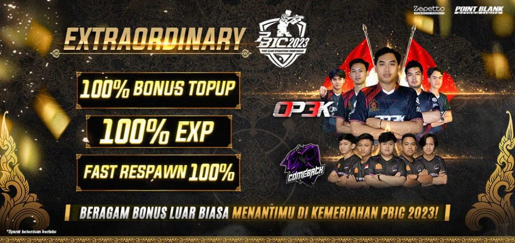 Baik untuk Troopers setia maupun untuk Troopers yang baru bergabung, ini adalah saat yang tepat untuk bermain Point Blank. Demi memanjakan Troopers, Point Blank mempersembahkan event Extraordinary PBIC 2023 untuk merayakan kemenangan Indonesia. Event ini membawa keuntungan berupa Bonus Topup PB Cash sebesar 100%, Boost EXP 100% dan Fast Respawn. Event Extraordinary PBIC hanya berlangsung selama periode terbatas, jadi jangan sampai ketinggalan ya! Segera login dan cek informasi selengkapnya di pointblank.id
