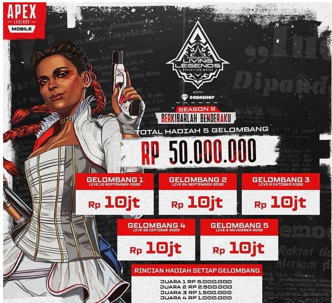 Di musim kedua ini, acara #IndonesianLivingLegends bersama Codashop akan dilaksanakan selama 2 bulan, tepatnya dari bulan September 2022 sampai November 2022. Akan ada 5 gelombang, di mana masing-masing memiliki total hadiahnya senilai Rp 50.000.000.