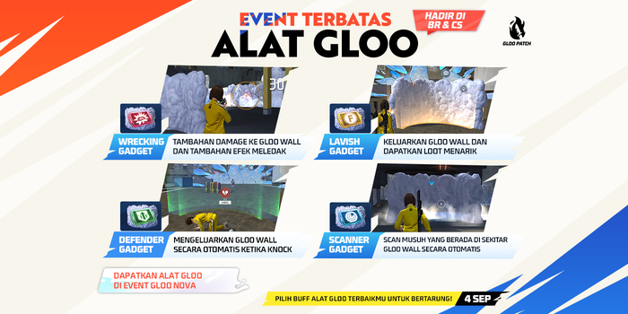 Tidak ketinggalan, Free Fire juga memperkenalkan event terbatas bernama ‘Alat Gloo’. Dalam event ini, pemain bisa memilih satu dari empat Alat Gloo yang tersedia, masing-masing memberikan buff unik yang dapat digunakan di mode BR dan CS. Berikut adalah penjelasannya:
