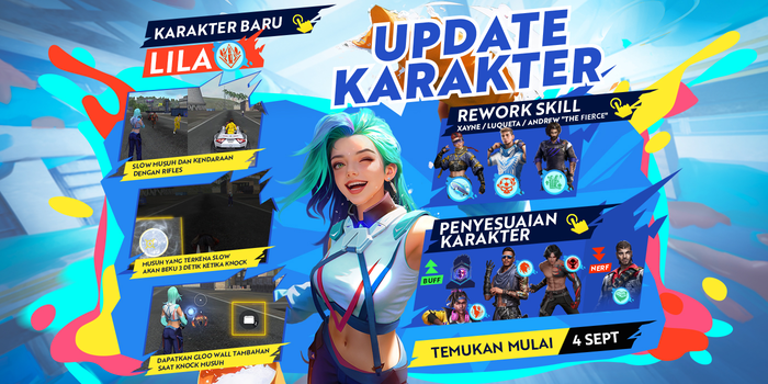 Gloo Patch Free Fire memperkenalkan karakter baru bernama Lila, seorang seniman yang bereksperimen dengan Gloo. Lila memiliki kemampuan untuk memperlambat gerakan musuh hingga 10% dengan tembakan senjata rifle-nya. Jika lawan menggunakan kendaraan, Lila dapat memperlambat laju kendaraan tersebut hingga 50% selama 3 detik. Jika lawan knock dalam kondisi ini, mereka akan membeku selama 3 detik, dan Lila akan mendapatkan tambahan satu Gloo Wall.
