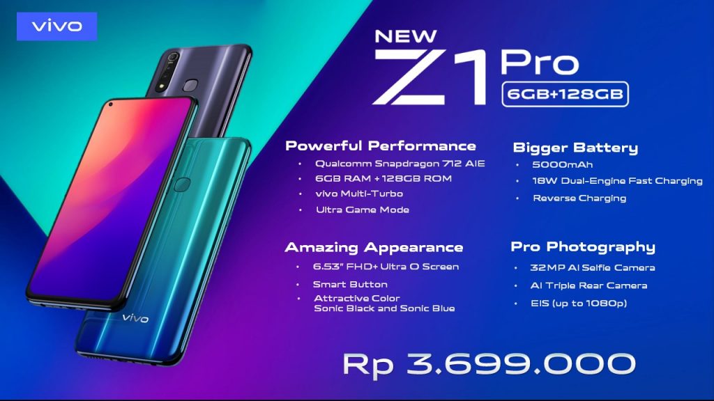 Untuk memenuhi kebutuhan pelanggan saat ini, vivo Z1 Pro 6GB dilengkapi dengan Snapdragon 712 AIE, baterai 5000 mAh yang dilengkapi teknologi 18w Dual-Engine Fast Charging, RAM 6GB, dan memori internal 128GB yang dapat diperluas hingga 256GB dengan tambahan kartu microSD. Selain itu, vivo Z1 Pro 6GB juga mengusung layar Ultra O Screen pertama oleh vivo dengan bentang 6,53 inci dan aspek rasio 19.5:9. Layar Z1 Pro 6GB juga dilengkapi dengan Schott Xensation 3D Glass Protection untuk perlindungan layar sehingga tidak mudah rusak.