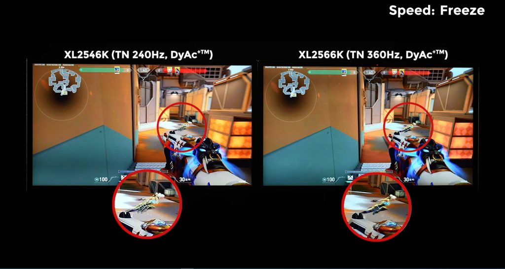 DyAc+™ pada XL2566K membuat aksi ekstrim di dalam game seperti spraying menjadi lebih jernih daripada DyAc+™ pada XL2546K. Kejelasan tampilan dapat membantu gamer untuk melihat posisi musuh saat bergerak cepat atau target yang bergerak cepat dengan lebih mudah dan melihat lintasan peluru dengan lebih jelas sehingga dapat membantu recoil control dan aim. Dibandingkan dengan layar IPS 360Hz pada umumnya, DyAc+™ pada panel TN 360Hz bisa memberikan outline yang lebih jelas sekaligus lebih tajam dari gambar bergerak secara keseluruhan sehingga membantu gamer untuk fokus serta mengurangi gangguan dari afterimage yang tidak diinginkan dalam game.